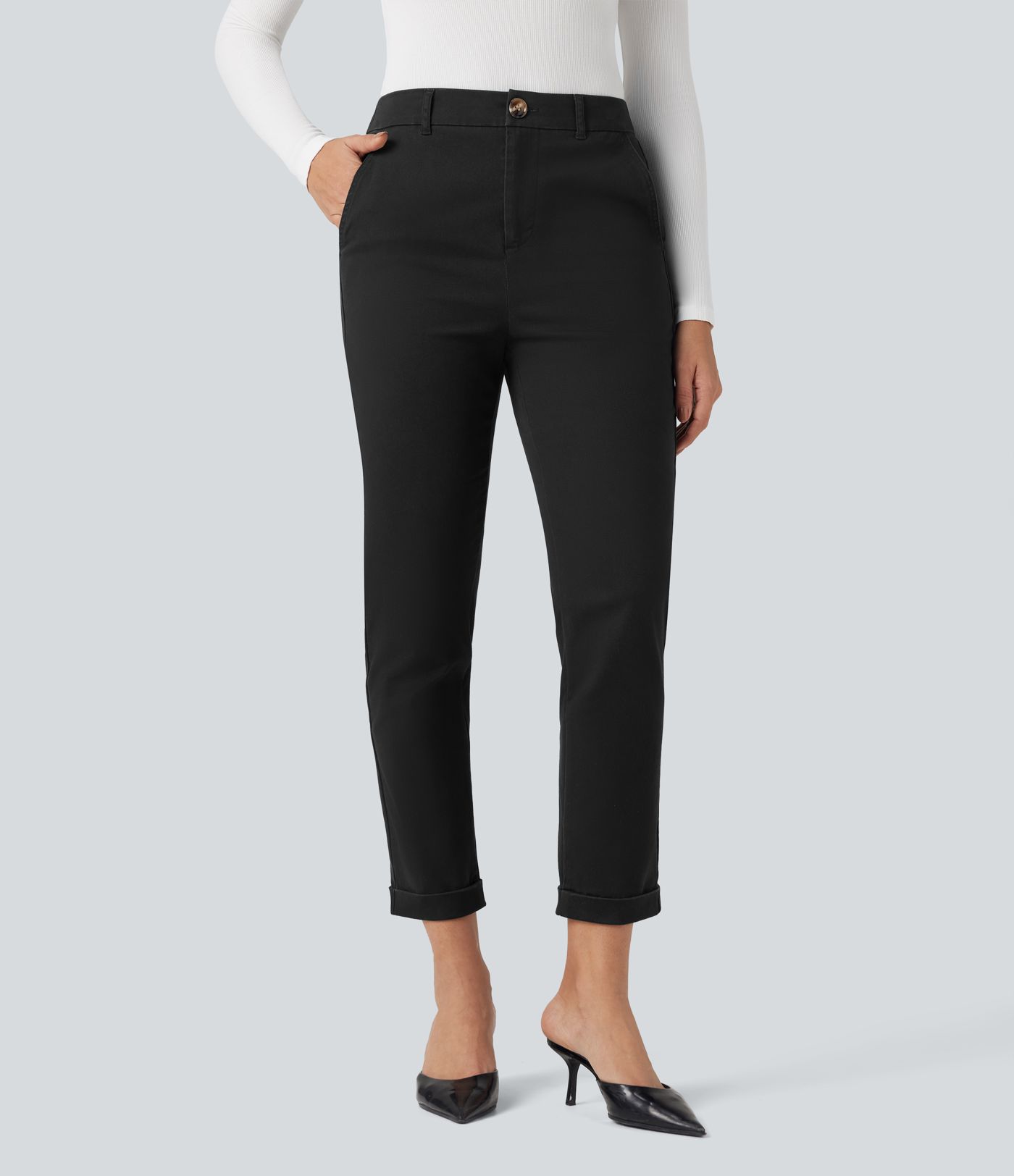 Pantalones slim casual 7/8 de tiro medio en algodón con bolsillos