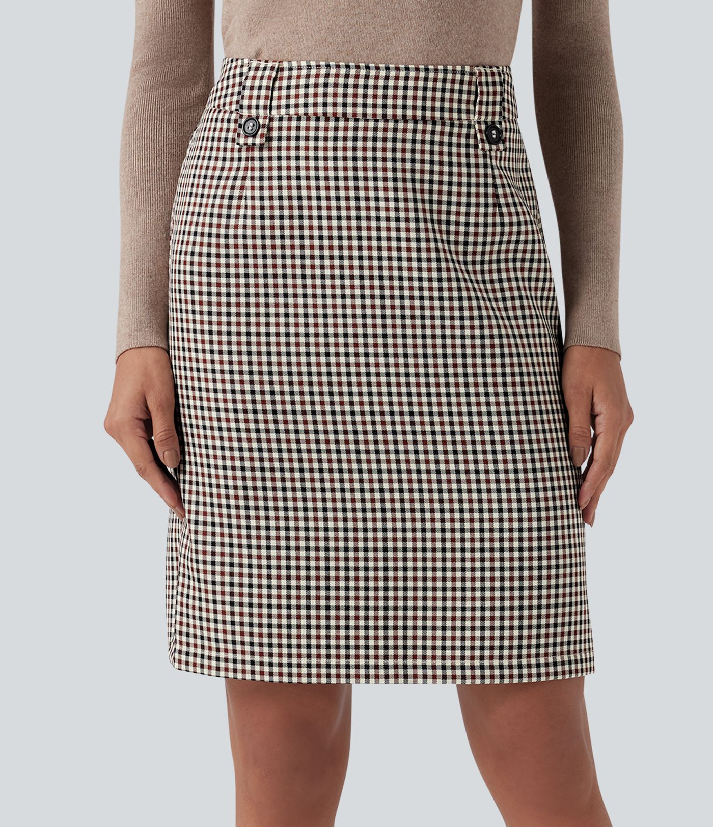 Mid Rise Zip Split Plaid Work Straight Skirt with Pockets