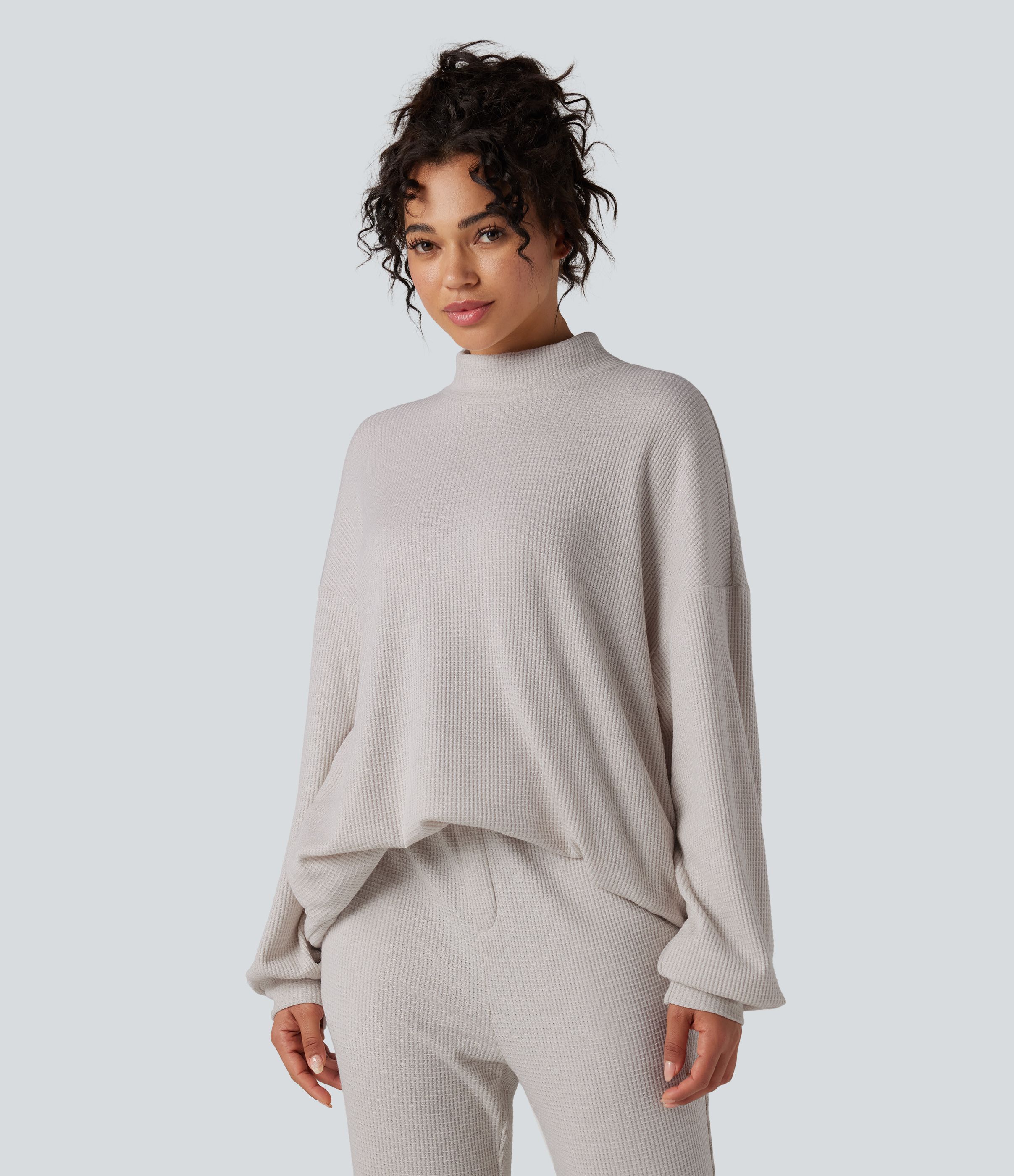 Mock Neck Long Sleeve Relaxed Waffle Casual Sweatshirt with Pockets