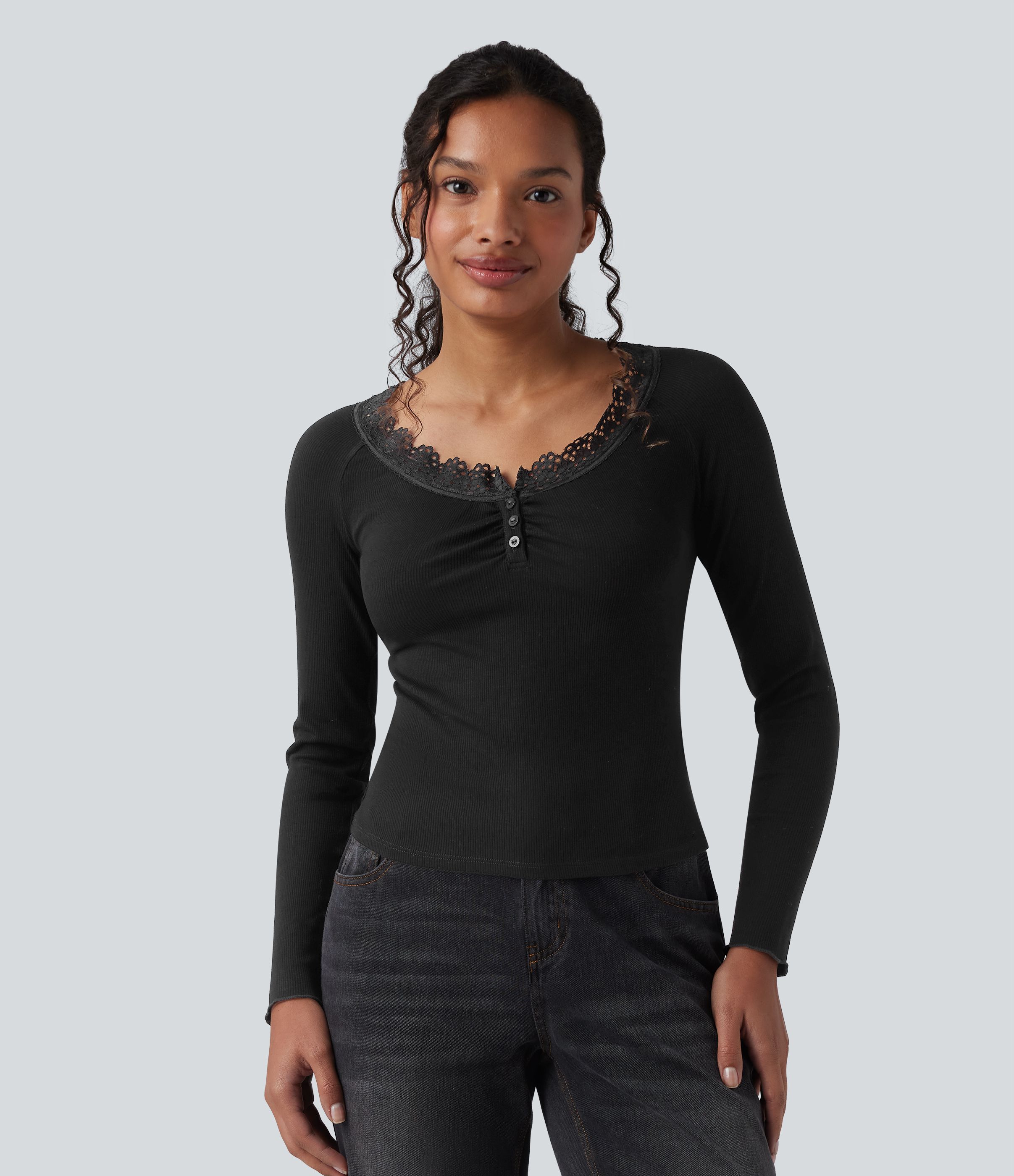 Ribbineuloksinen Henley-toppi kontrastipitsillä, pitkähihainen ja rento