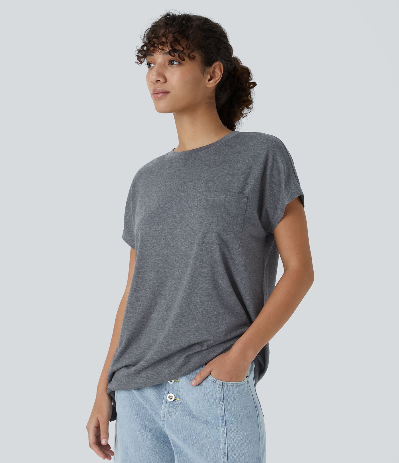 Round Neck Pocket Hem Relax Casual T-Shirt