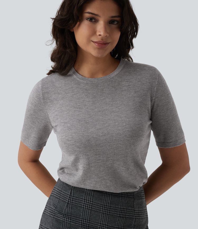 Round Neck Short Sleeve Slim Work Silk-Wool Blend Sweater