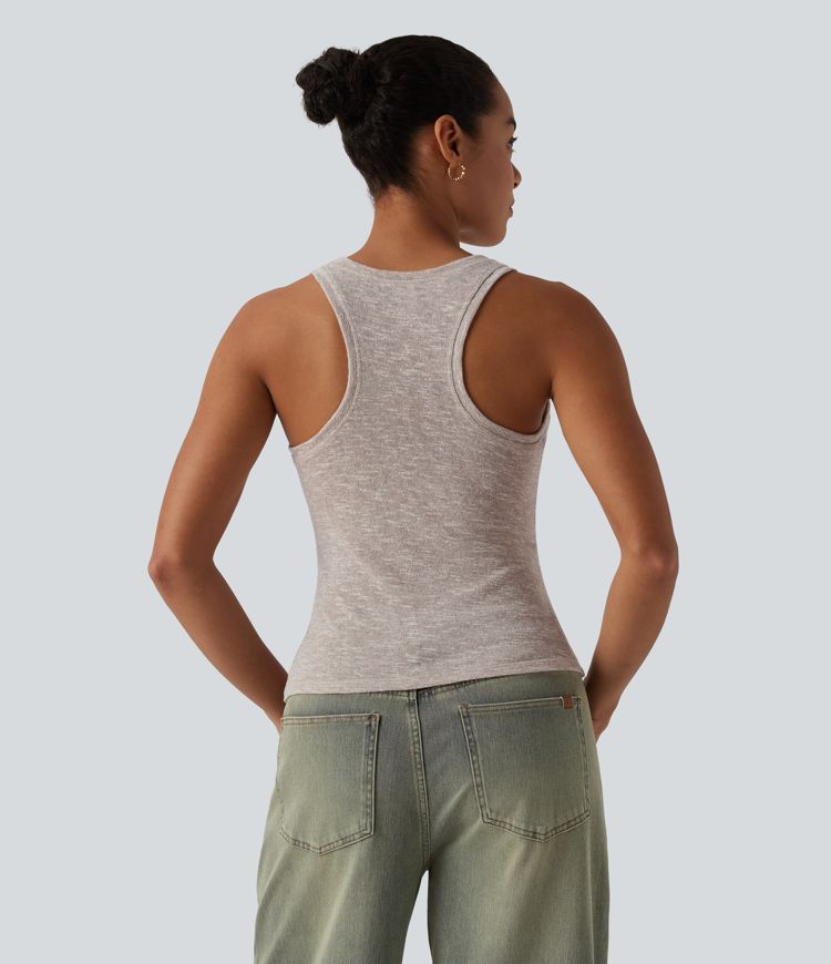 Semi Sheer Heathered Henley Racerback Casual Tank Top