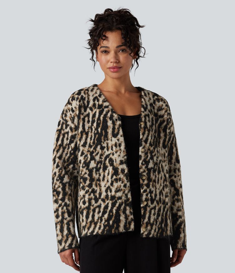 V-neck Leopard Wool-Blend Casual Cardigan