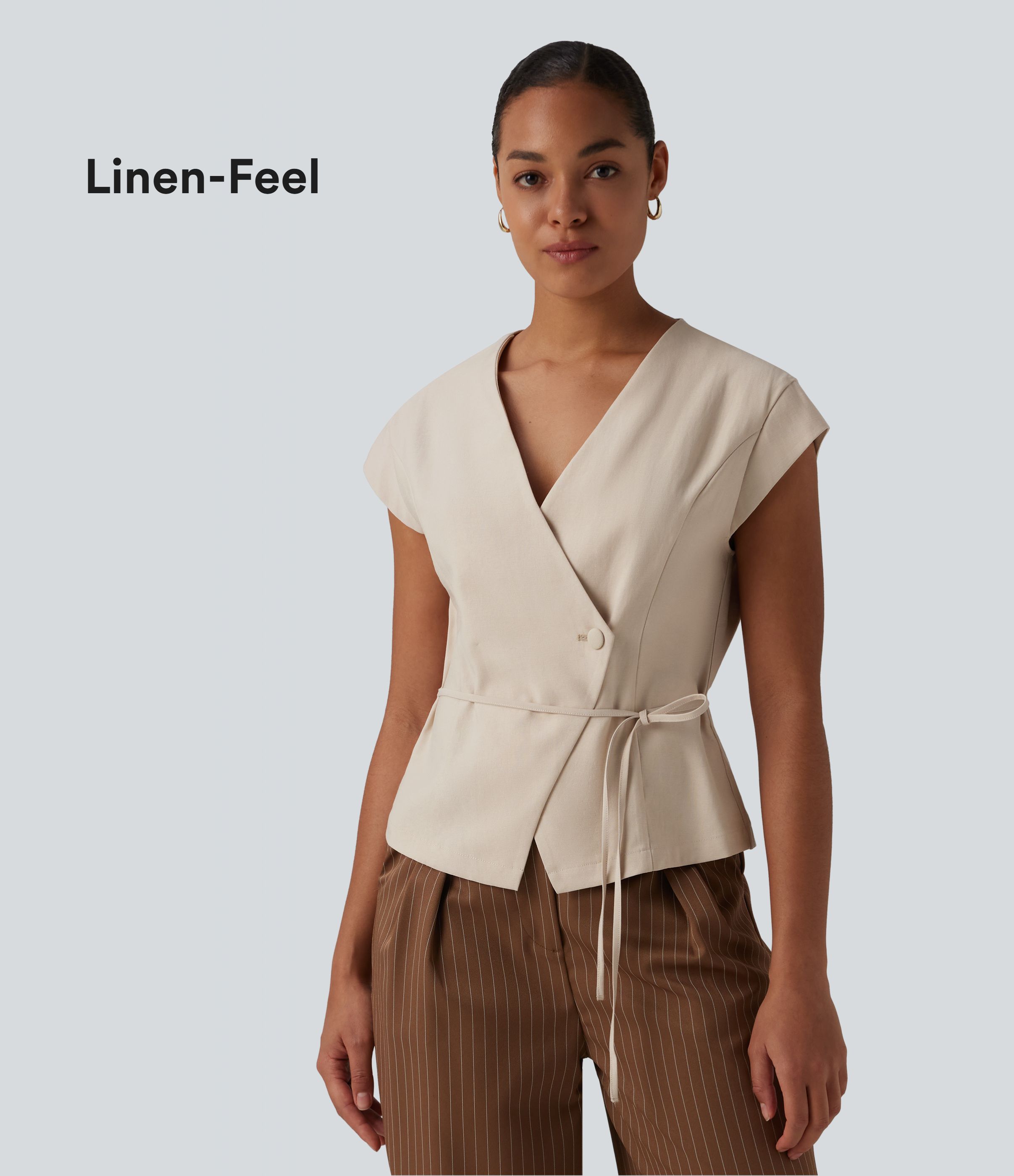 V Neck Short Sleeve Tie Front Work Linen-Feel Blouse