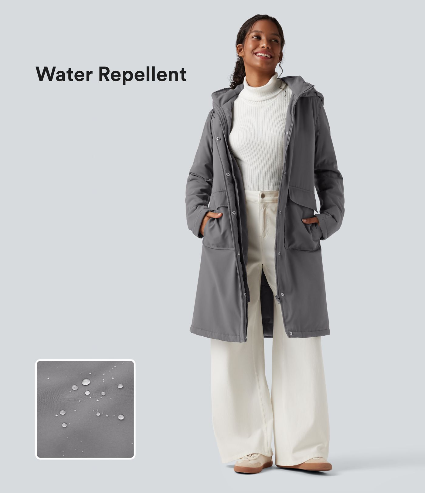 Water Repellent Hooded Drawstring Long Sleeve Longline Casual Parka with Pockets